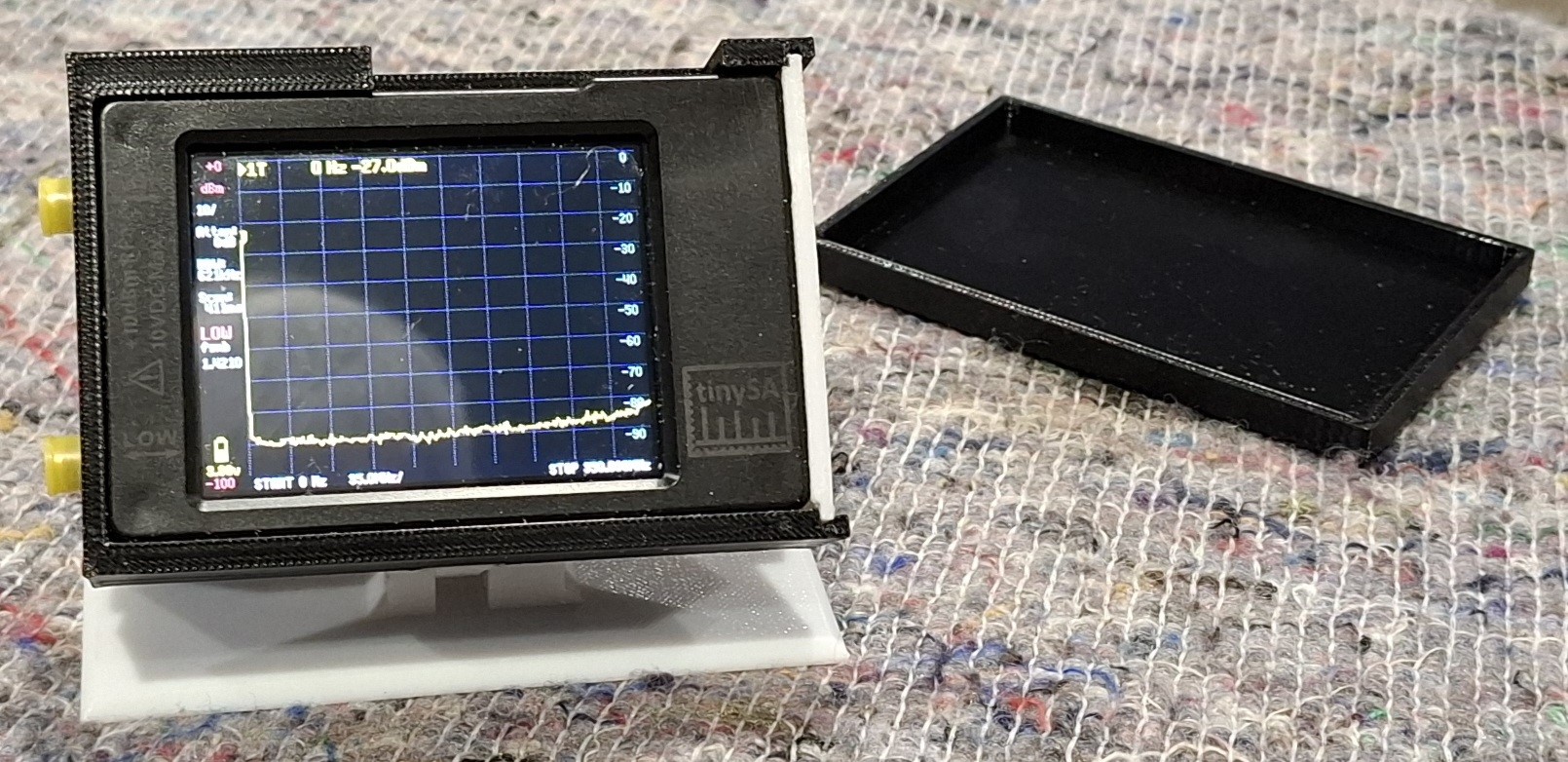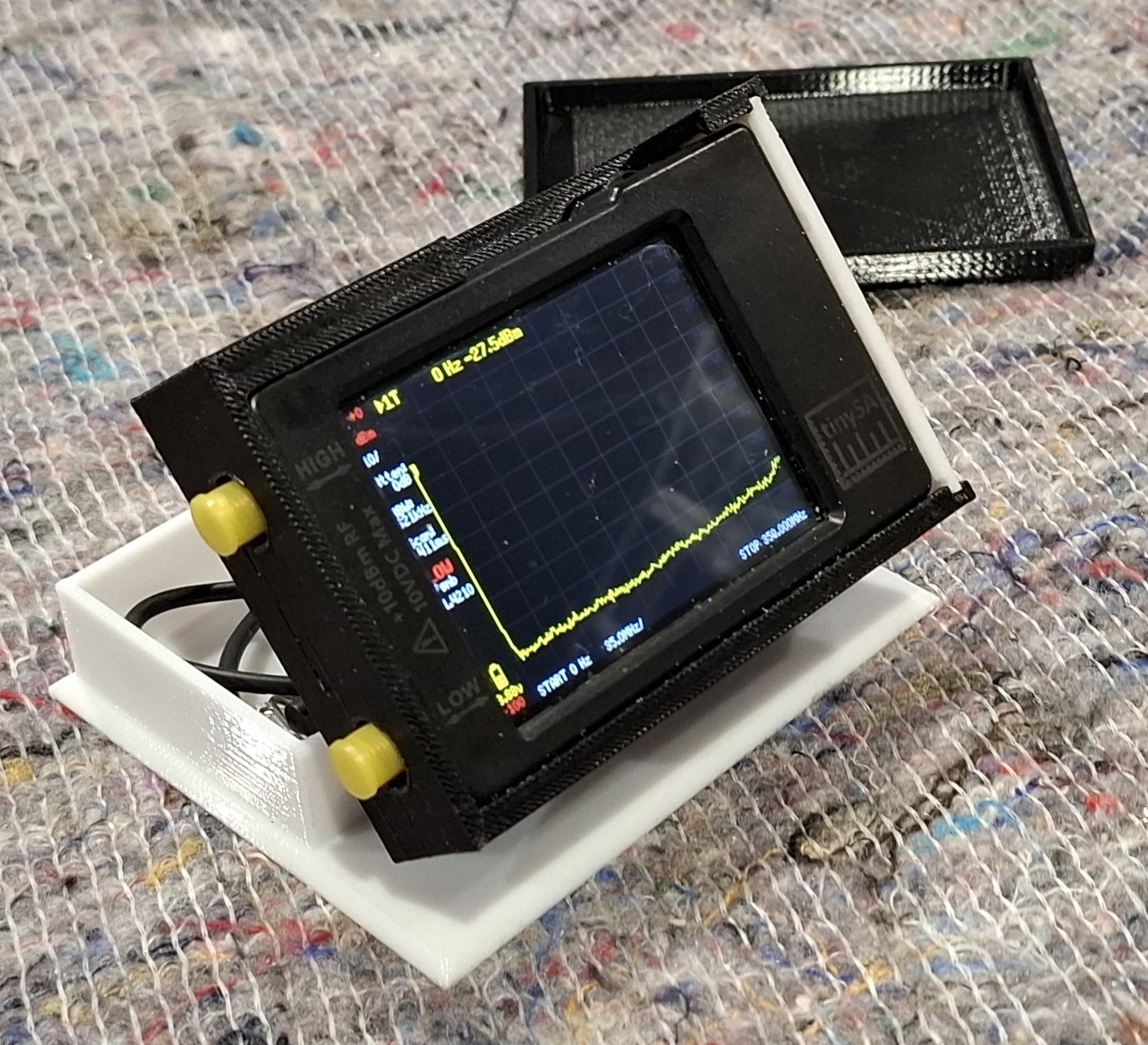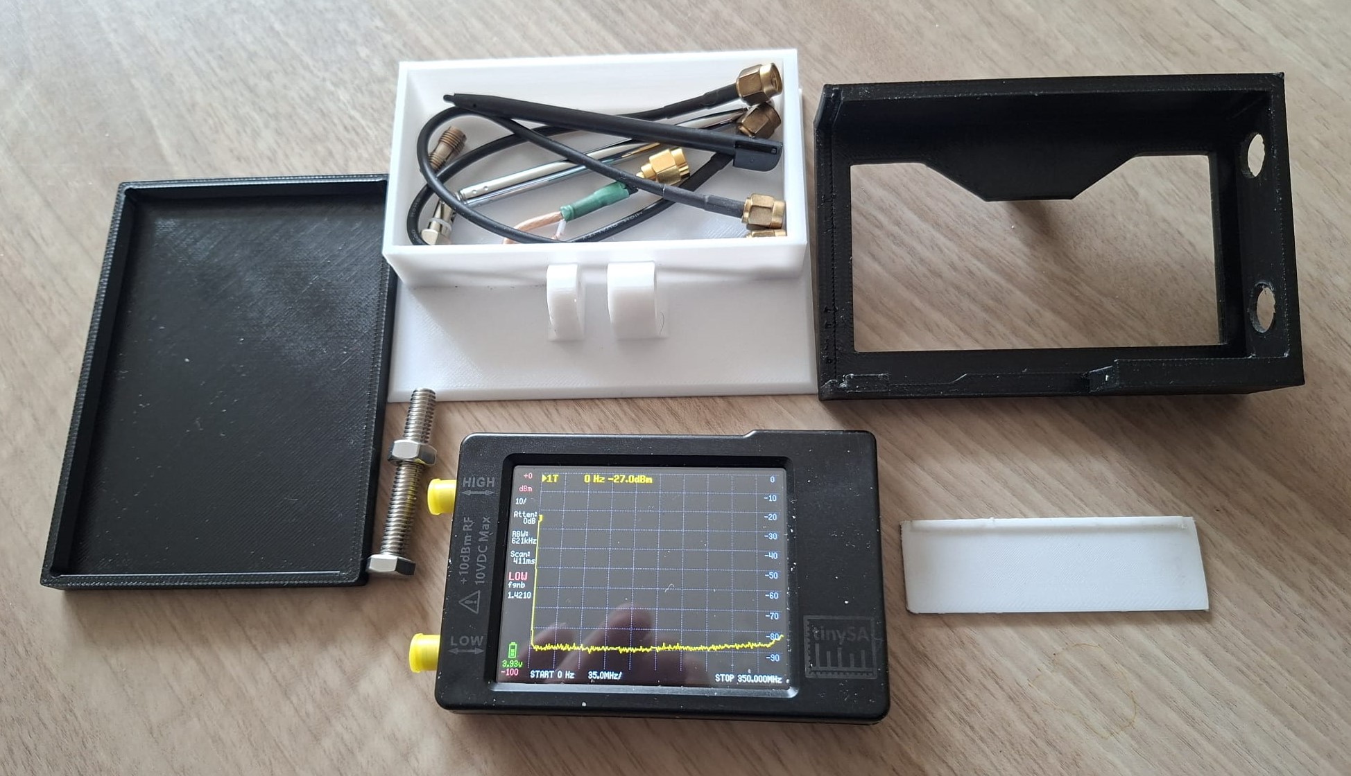 Henk (PA0JMD) had opnieuw niet stilgezeten. Voor de TinySA heeft hij een fraaie 3D-geprinte behuizing ontworpen, inclusief ruimte voor de bijbehorende kabeltjes. Bovendien kan de TinySA schuin worden opgesteld, wat het aflezen een stuk comfortabeler maakt.