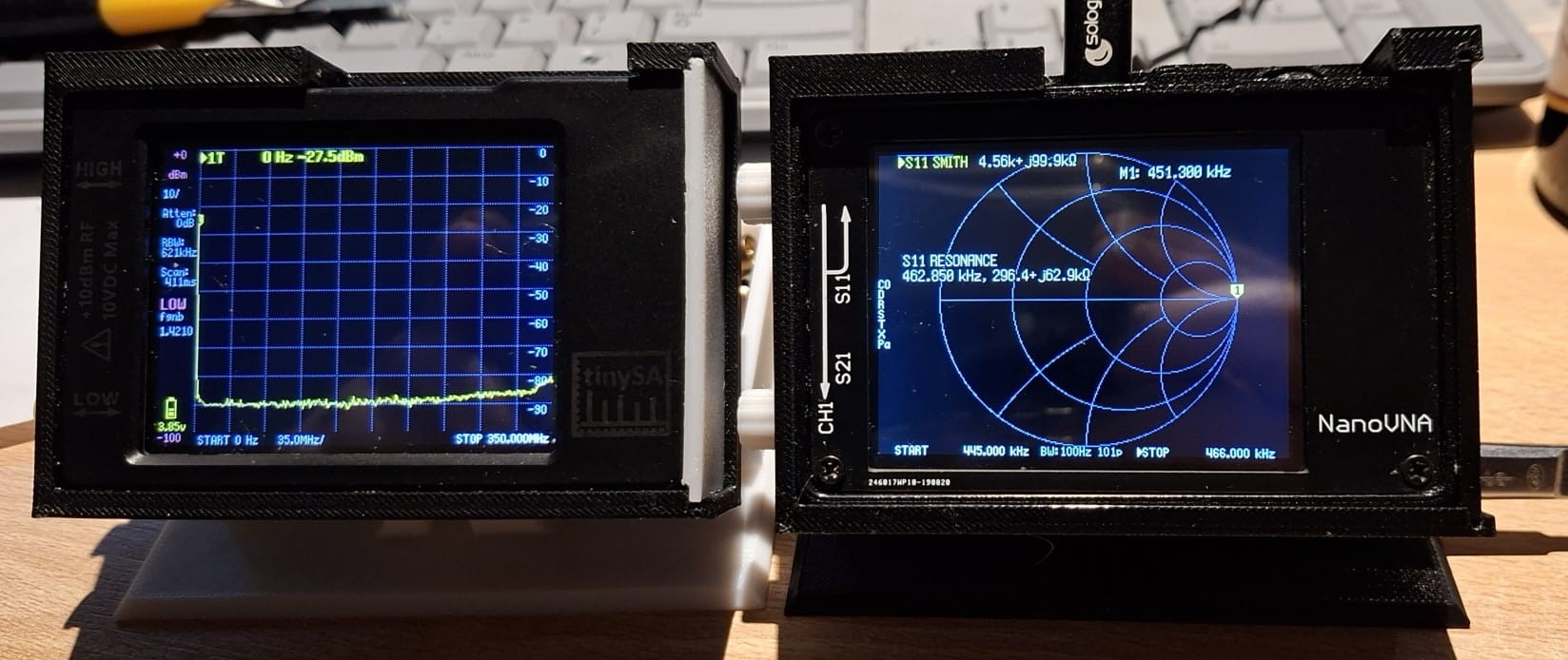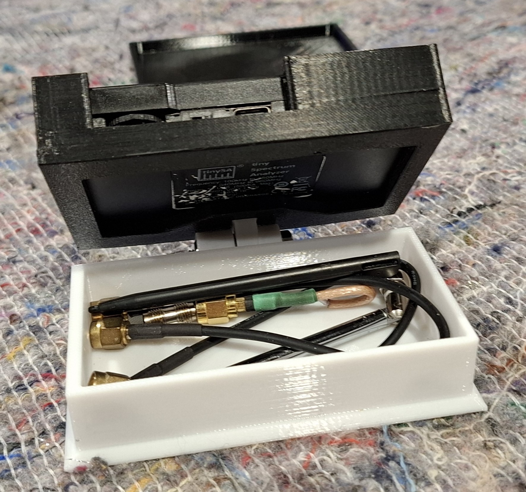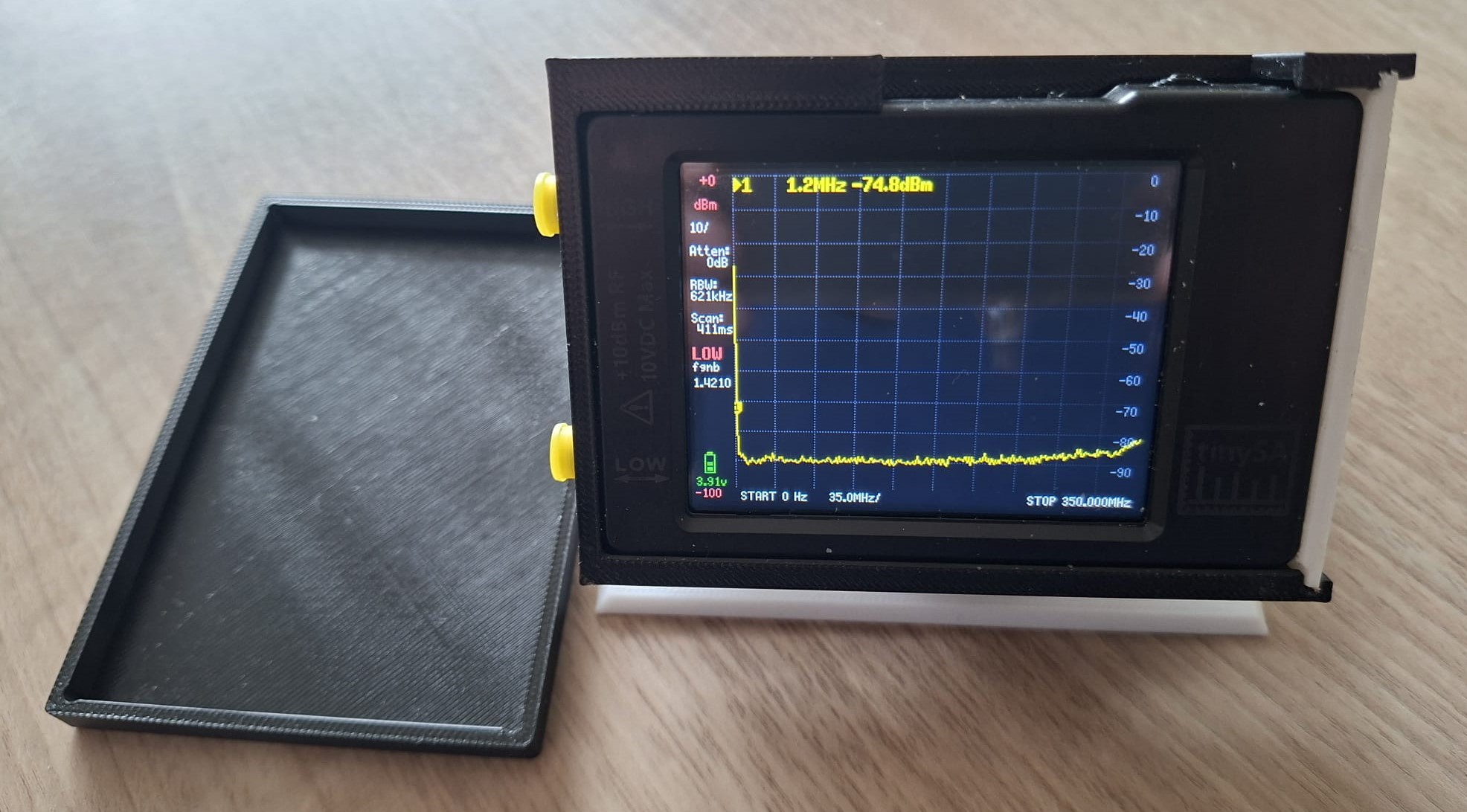 Henk (PA0JMD) had opnieuw niet stilgezeten. Voor de TinySA heeft hij een fraaie 3D-geprinte behuizing ontworpen, inclusief ruimte voor de bijbehorende kabeltjes. Bovendien kan de TinySA schuin worden opgesteld, wat het aflezen een stuk comfortabeler maakt.