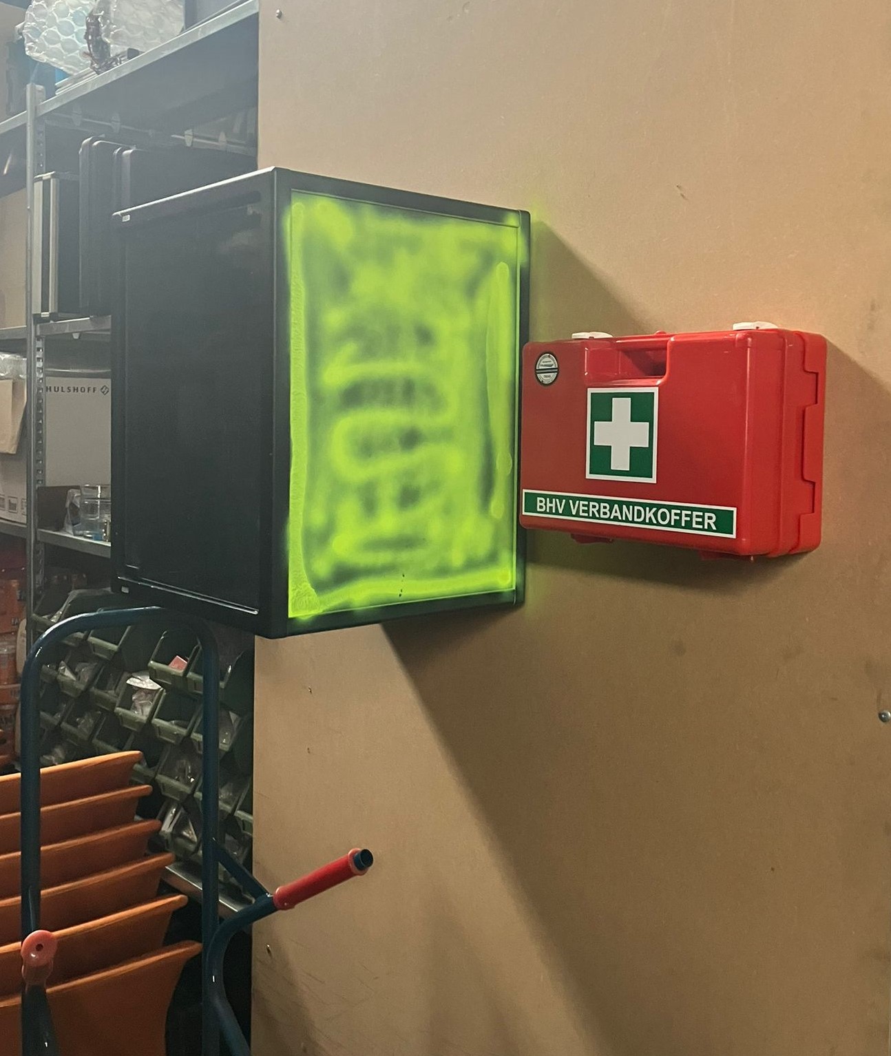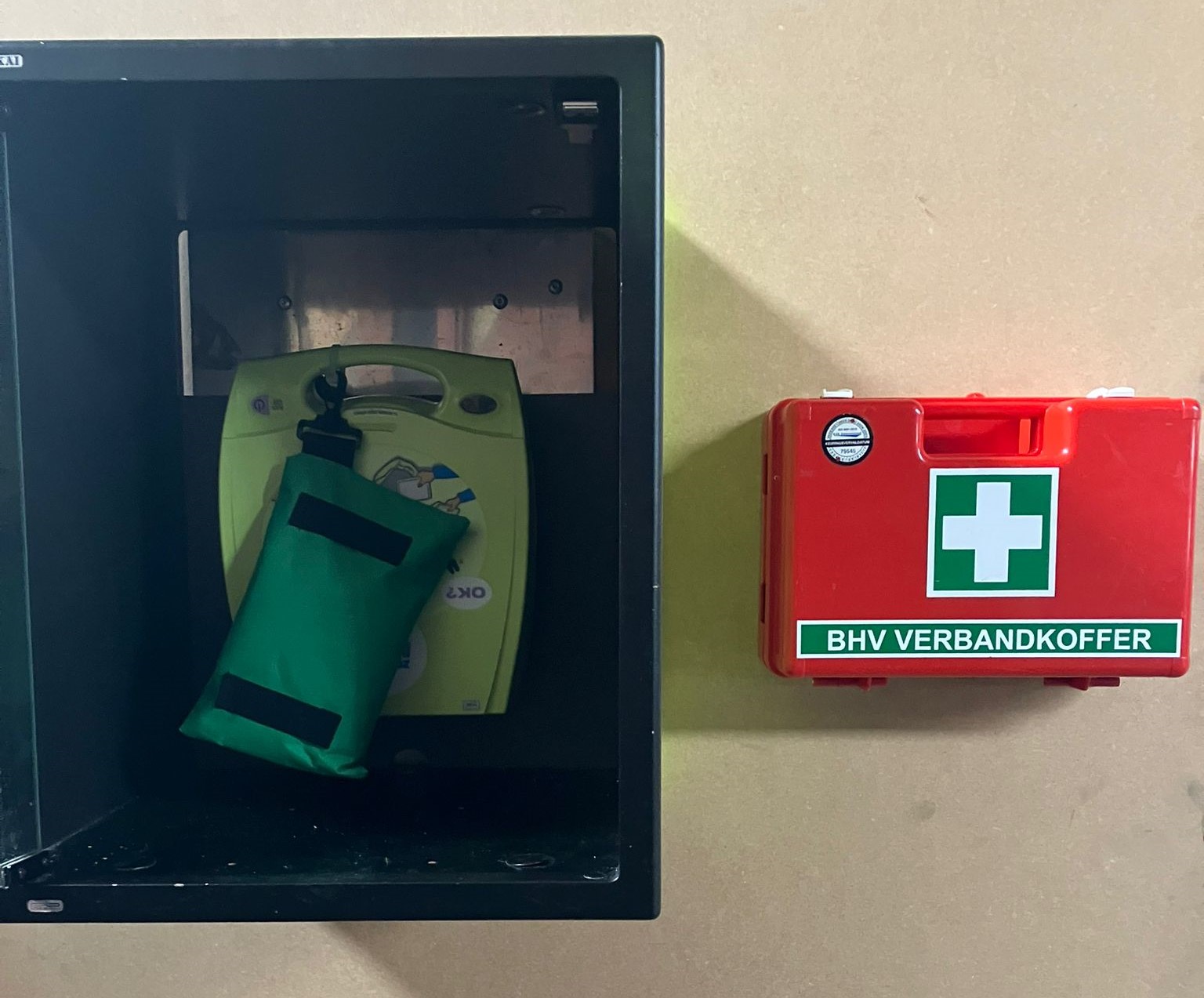 Voor maandag hadden we ook plannen gemaakt en zijn we langsgegaan bij onze tweedehandsleverancier. Nog maar net binnen kwamen we al twee bezoekers van de maandagavond tegen. Na een rondje door de winkel vonden we wat we zochten: een kastje om onze AED veilig aan de wand te kunnen monteren.