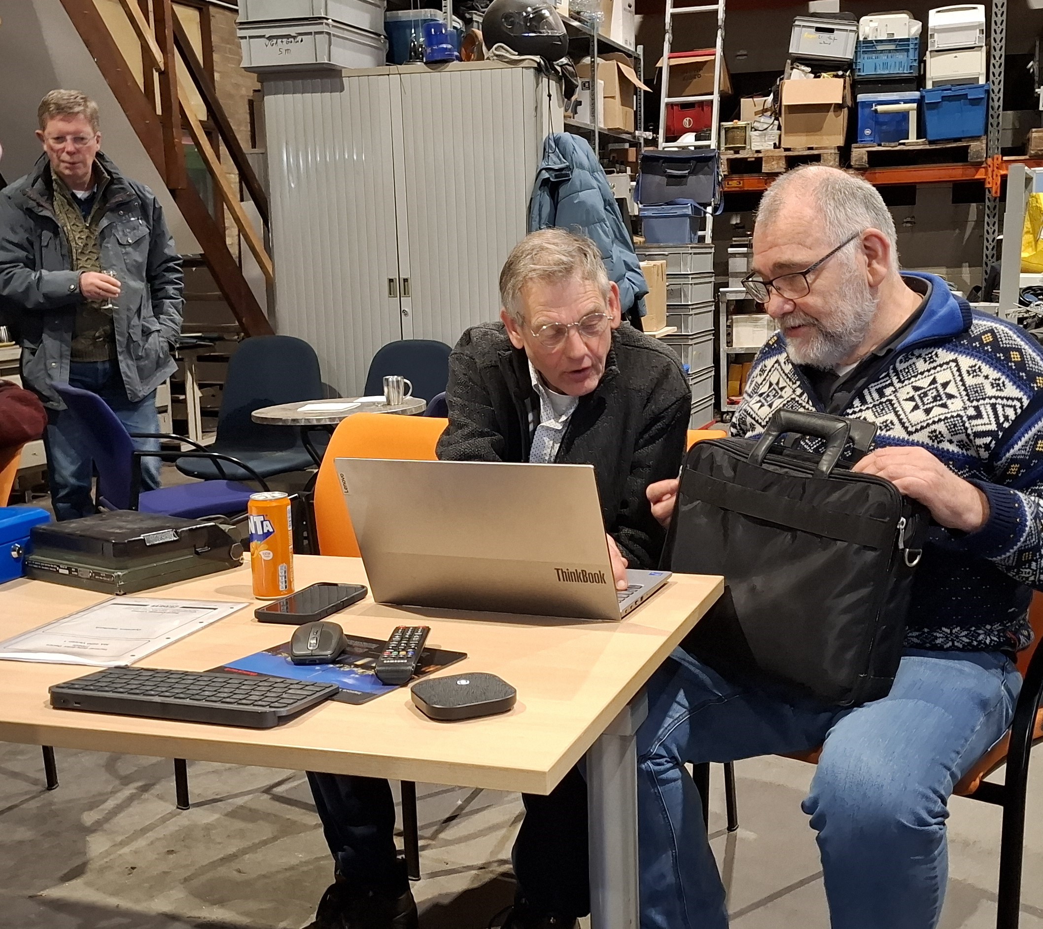 Rond 18:15 uur kwamen Adriaan (PA1LIO) en Jaap (PD5ISW) de loods binnen. Na verloop van tijd begon de ruimte zich prettig te vullen. Er waren diverse mensen die elkaar nog wat bij te praten hadden vanwege de nieuwjaarsbijeenkomst. Omdat Rick (PA11631) ook in Amersfoort aanwezig was, werd MS Teams daar door hem opgestart en via dat medium sloten zich eveneens enkele gebruikers aan.