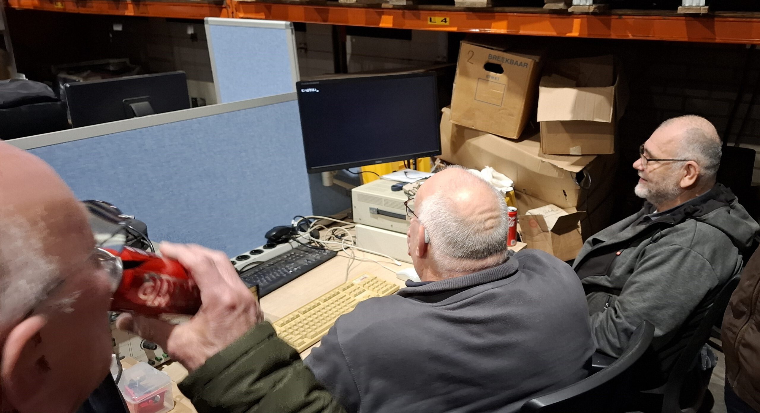 Na wat e-mailverkeer en uitzoekwerk zijn we weer begonnen met opruimen om daarna, in de middag, de ruimte gereed te maken voor de bijeenkomst. Simon (PA0SLW) wilde iets uitproberen waarvoor een oude DOS-computer nodig was, die in de loods nog ergens tussen de opgeslagen spullen stond. Deze hebben we opgezocht, op tafel gezet en snel aangesloten. Wat nog ontbrak was een muis met een Compaq-aansluiting. Dat bleek nog even een uitdaging, maar na enig zoeken wist Jan er toch één te vinden, waardoor de DOS-computer ook daadwerkelijk tot leven kwam.